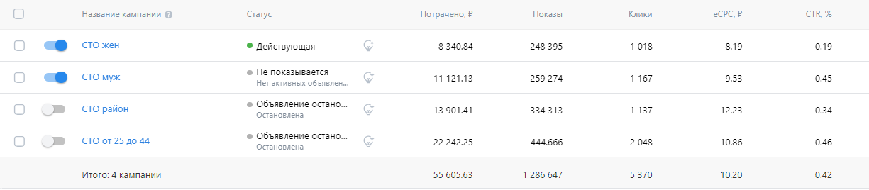 Выбрал KPI для оценки эффективности: CPL (цена заявки), CR (конверсия из клика), ROI, количество записей на конкретные услуги и уровень повторных обращений.